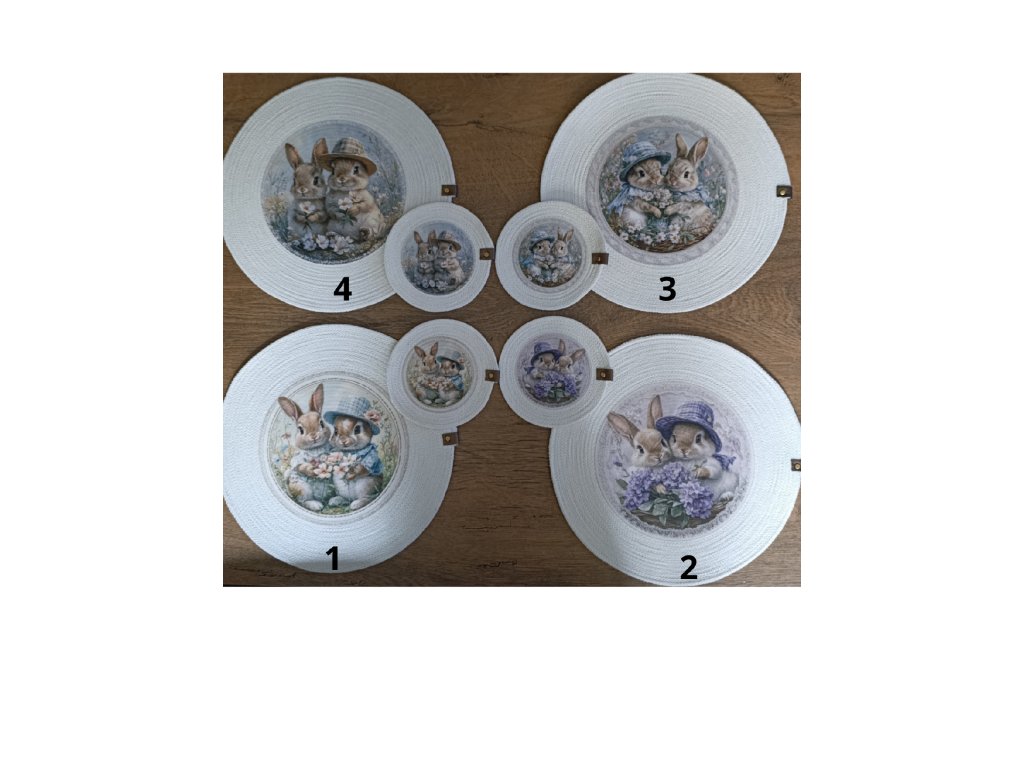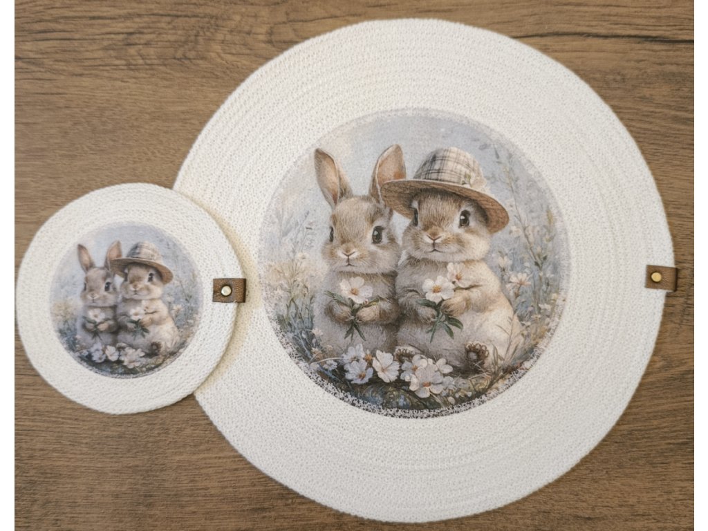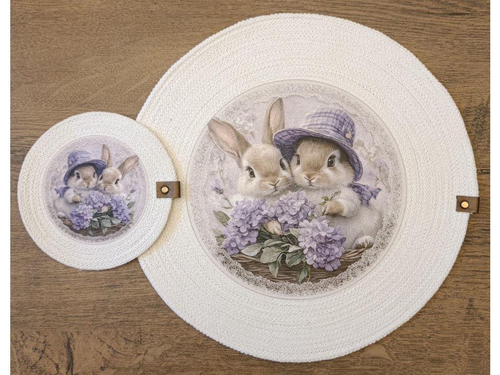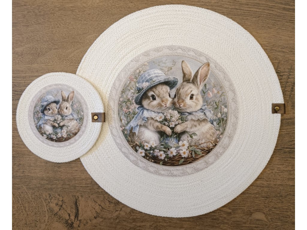 Dodejte svému stolu jedinečný vzhled s touto originální sadou prostírky a podšálku z kvalitních bavlněných šňůr. Jemný potisk králíčků v romantickém stylu vytváří příjemnou atmosféru při každém stolování.